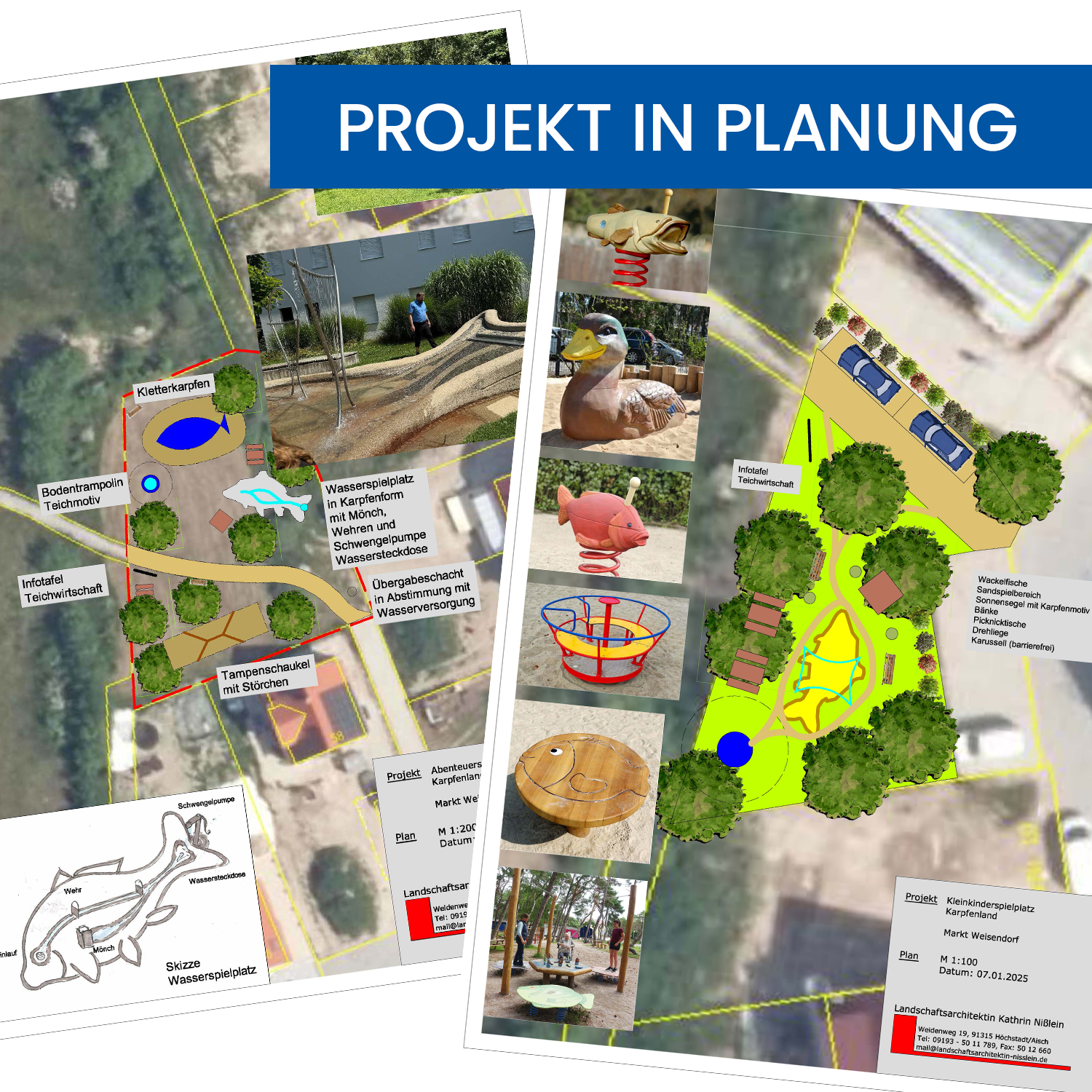 Zwei Spielplätze sollen in Weisendorf entstehen. Abenteuerspielplatz Karpfenland und Kleinkinderspielplatz Fische. Kinder aller Altersgruppen sollen spielerisch an die Themen Karpfen, Teichwirtschaft und Regionalidentität herangeführt werden.